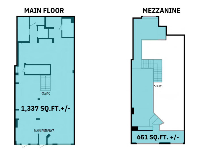 The layout includes approximately 1,337 SF ± on the main floor and 651 SF ± on the mezzanine, offering flexibility for retail display, treatment rooms, offices, or storage. Visitors will appreciate abundant street parking along 17th Avenue, as well as convenient access to underground parkade stalls and ample public visitor parking. Zoned C-COR1 and available immediately, this opportunity provides a turnkey solution in a highly sought-after urban location with strong surrounding demographics and steady traffic flow.